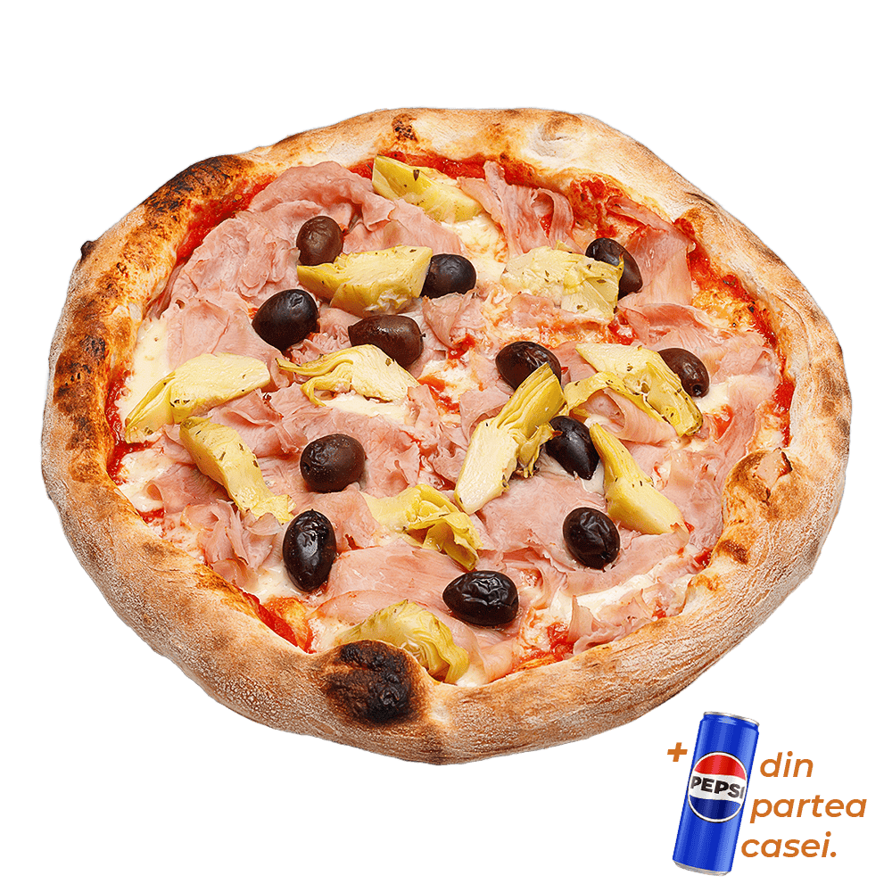 Ingrediente: sos roșii, mozzarella fior di latte, prosciutto cotto, carciofi, măsline kalamata, ulei de măsline.