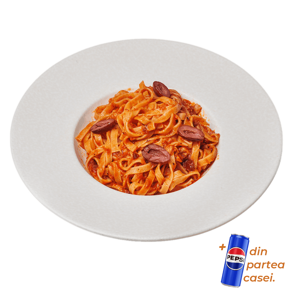 Ingrediente: tagliatelle, sos napoli, măsline kalamata, ton, busuioc.
