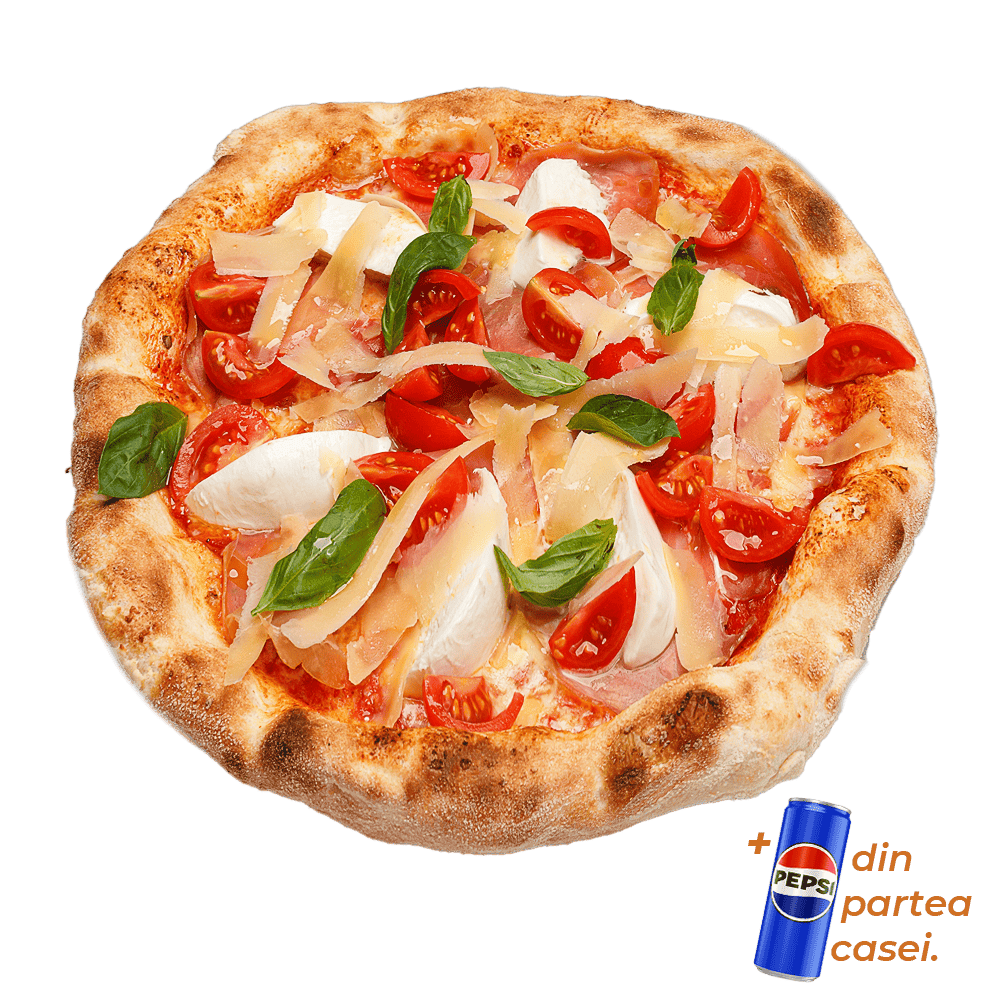 Ingrediente: sos de roșii, mozzarella fior di latte, prosciutto crudo, mozzarella buffala, parmezan felii, roșii cherry, ulei de măsline extravirgin, busuioc proaspăt.