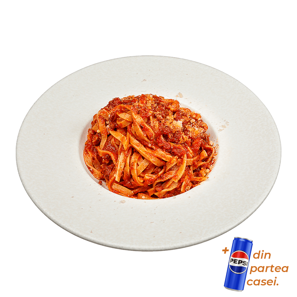 Ingrediente: tagliatelle, sos napoli, ragu de vită și porc, parmezan.
