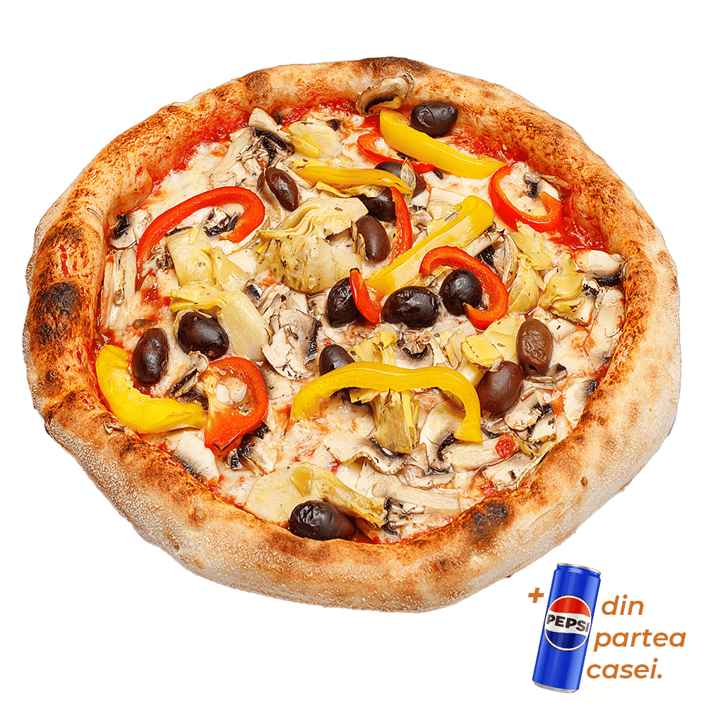 Ingrediente: sos roșii, mozzarella fior di latte, prosciutto cotto, salam napoli, carciofi, ciuperci champignon proaspete, măsline kalamata. Gramaj: 550gr